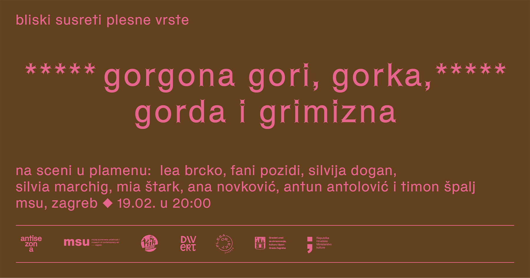 Prije osam godina, Bliskim susretima plesne vrste otvorile smo prvu ANTISEZONU ikad. Želja za bliskim susretom izvedbe i publike, za portalom između izvedbe i stvarnosti kroz koji možemo lakoćom ušetati i izaći, i dalje gori u nama. Gorjet će i Gorgona, u žaru užitka susreta na sceni.